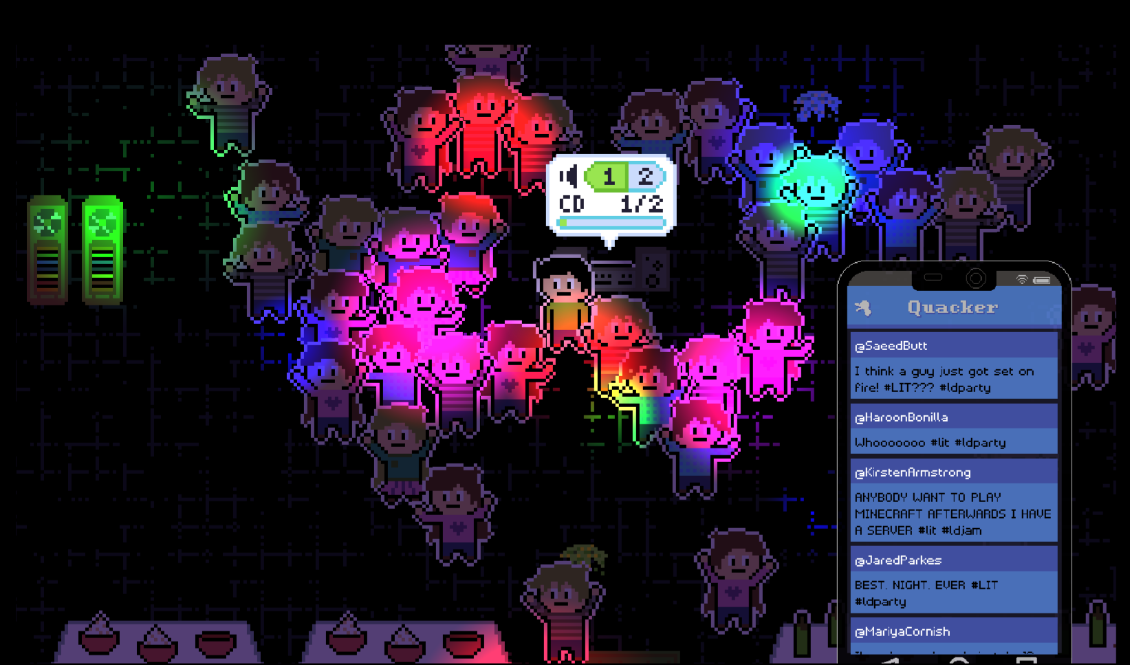 Our concept was that you're hosting a party that you have to "keep alive" by providing snacks, making sure music keeps playing, and just generally keep people happy.